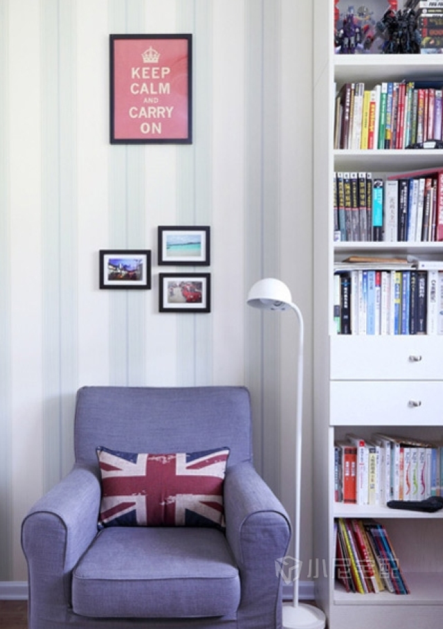可愛的單人沙發(fā)上,有一個英倫味兒十足的小抱枕,墻上的裝飾畫別有趣味。小小的落地燈給蜷縮在沙發(fā)中慵懶閱讀的時光帶來了光亮。