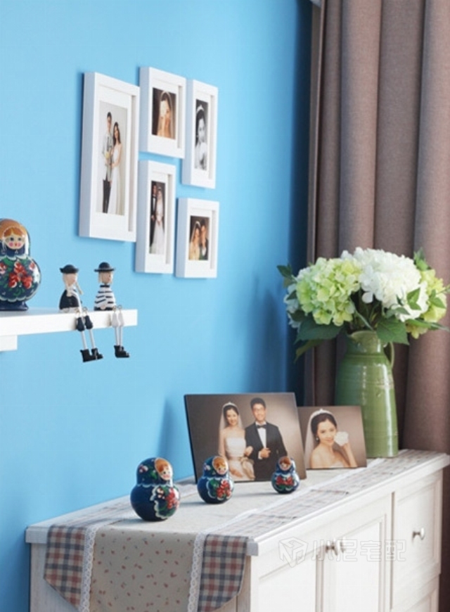 臥室里的一角。儲物柜上鋪了一塊小清新風格的桌旗,既防塵又美觀。桌面上的相框以及照片墻,無不體現(xiàn)著夫妻二人的感情甜蜜。