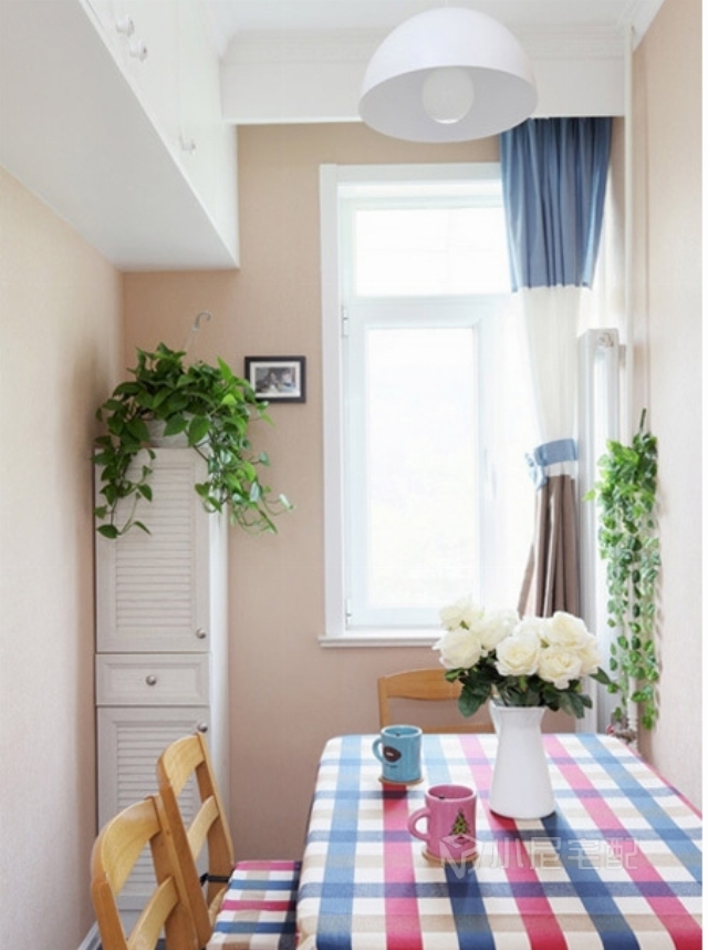 餐桌上的格子桌布帶著濃濃的英倫氣息,一藍一紅兩個小杯子剛好是情侶款,小房間里溫情滿滿。綠色植物的點綴恰到好處,讓空間瞬間清新起來。