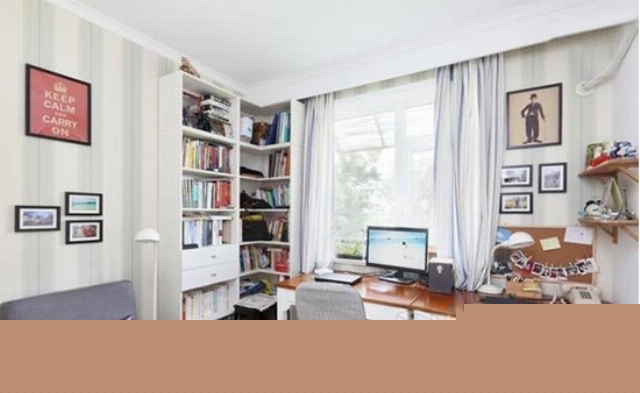 書房是一個獨立的房間,淺淡的黃綠色條紋壁紙讓空間變得清新起來,兩張書桌并在一起就成了一個雙人工作臺,轉(zhuǎn)角處的書架上密密麻麻擺滿了各種書籍,一把小凳子讓高處的書本也可以拿得到,窗外陽光正好,房間里灑滿甜蜜。