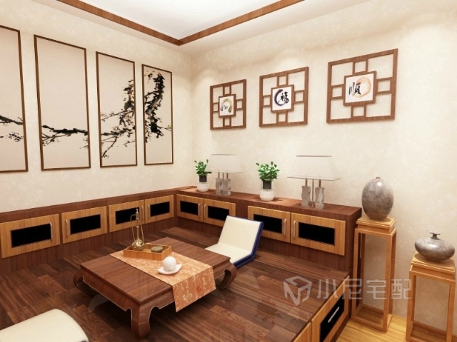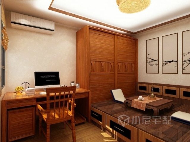 布置中式榻榻米,既可做書房又可做臥室,還可做茶室,水墨畫和木質(zhì)框架畫框營造書房雅致,家居的顏色也偏重一些,突出書房安靜穩(wěn)重的氣氛,使生活的實(shí)用性和對(duì)傳統(tǒng)文化的追求同時(shí)得到了滿足。