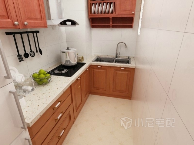 古樸的色調(diào)的現(xiàn)代廚房,明亮典雅,中式的地柜、吊柜、碗架等設(shè)施使整體空間感覺更加豐富,大而不空、厚而不重,有格調(diào)又不顯壓抑,既美觀又功能齊全