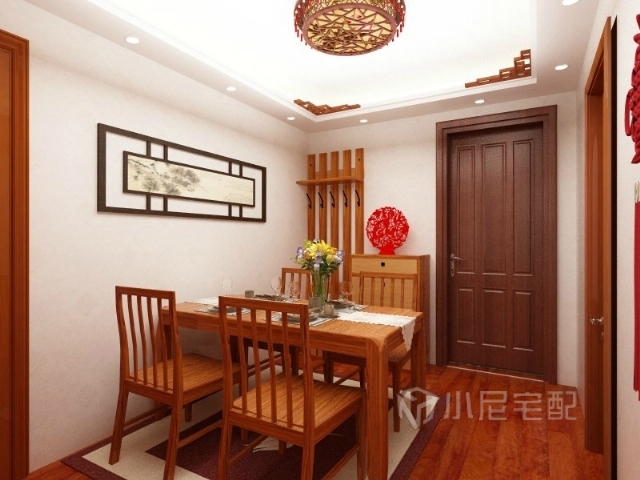 餐廳:使用木材家具,更烘托家居生活的溫馨,避免了現(xiàn)代家居帶來的冰冷感,同時(shí)營造中式氛圍。入門處鞋柜用鏤空做裝飾,原木色調(diào)與室內(nèi)家具統(tǒng)一,擺設(shè)采用紅色的中式元素。