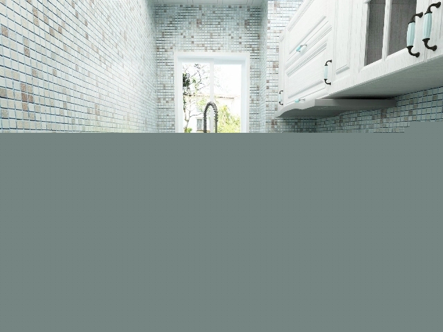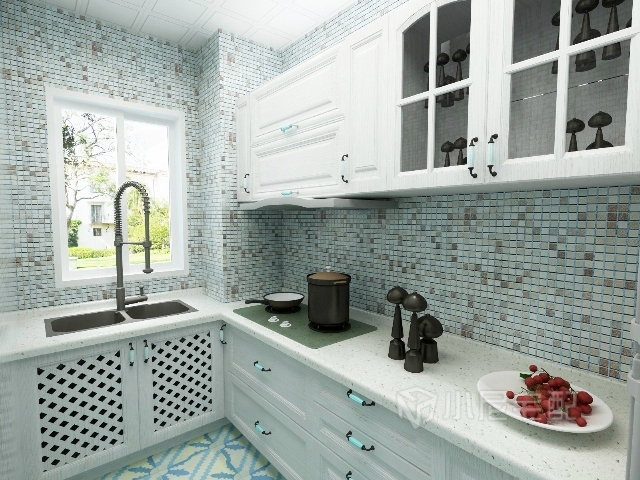 白色天花板吊頂,搭配馬賽克墻面和瓷磚拼花地面,帶來一股明媚田園氣息。淡雅的藍(lán)白色的結(jié)合,仿佛將人帶入大海世界中,將廚房映襯的明媚動(dòng)人。