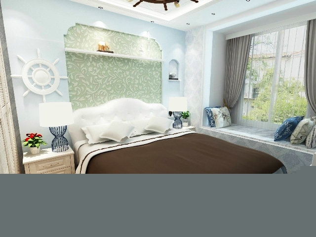 主臥:淺色的小尼家具,地中海風(fēng)格的燈和墻飾,精致的綠植,從整體到細(xì)節(jié)無一不透出溫馨浪漫之感。