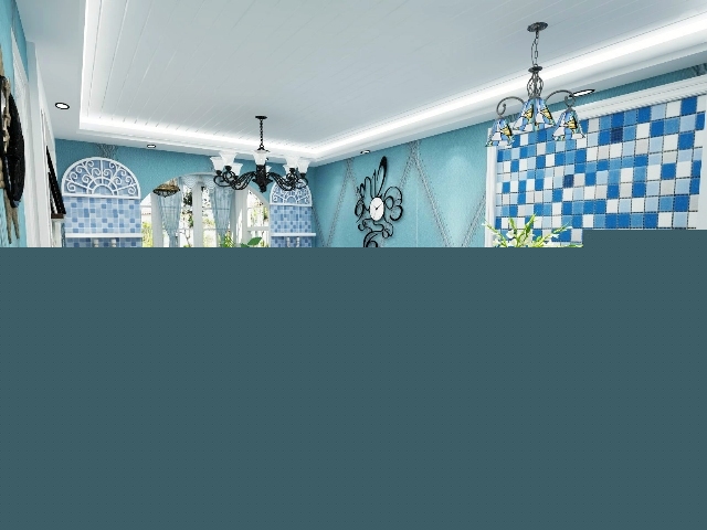 餐廳:背景墻采用藍(lán)色拼磚,白色的餐桌椅搭配藍(lán)色條紋的桌旗、椅墊,吊燈和拱形的酒柜烘托地中海氣氛,一把清幽的花束,襯托的家里的溫情脈脈。