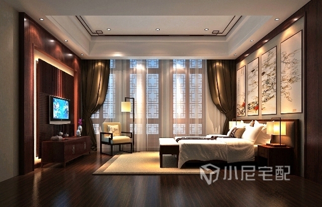 臥室秉承了傳統(tǒng)古典風格的典雅和華貴,暗紅色的衣柜,木原色的床頭柜以及原木色的地板,還有電視背景墻以菊花來裝飾,徒增了高貴的氣息,整體顯示出的富貴、高雅。