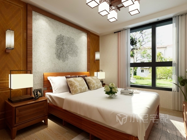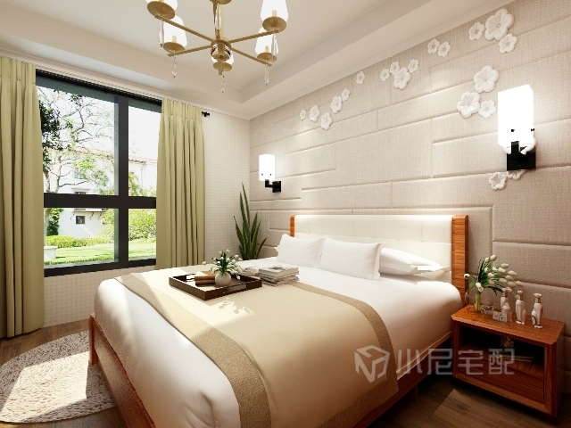 軟包的臥室背景墻簡約時(shí)尚,配以白色的五角梅的點(diǎn)綴,增加一份恬靜。淡綠色的窗簾與黃金柚木的家具結(jié)合增加了自然的氣息。