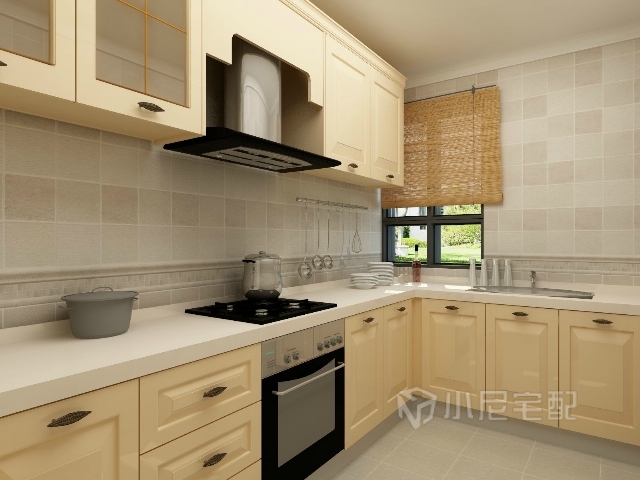 廚房選用了帶有田園風(fēng)格的櫥柜,功能齊全,簡約時(shí)尚。