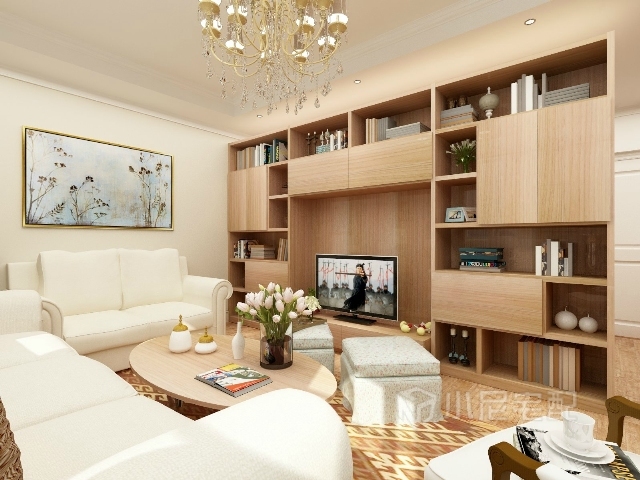 一整面電視墻既有強(qiáng)大的儲(chǔ)物功能,又起到隔斷的作用。