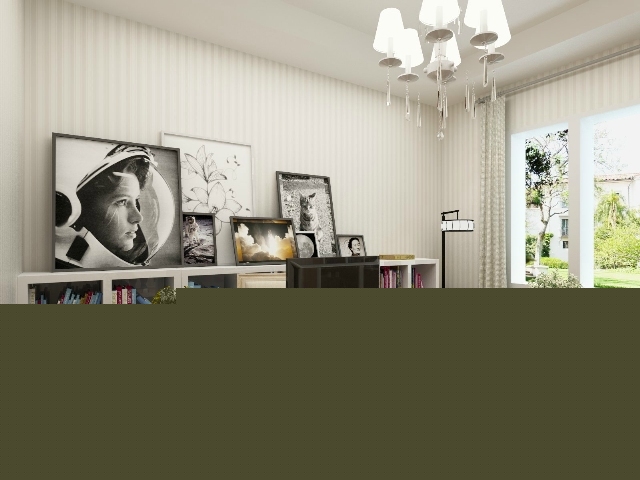 素色的條紋壁紙,窗前的休閑桌椅,多幅大小不一的裝飾畫,打造一個(gè)現(xiàn)代的舒適的書房。