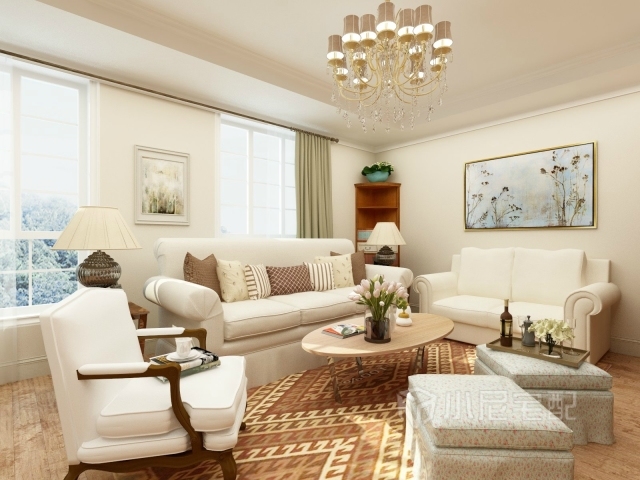 白色的沙發(fā)搭配淡藍(lán)色碎花沙發(fā)凳,白色的墻搭配草綠色的窗簾,顯得干凈簡潔。