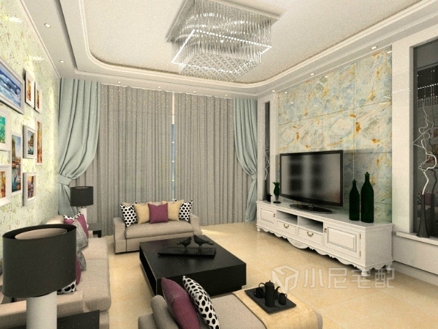 暖色基調(diào),電視墻主要是彩粒漆。頂部簡單造型。