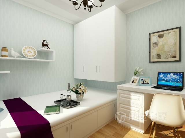 榻榻米加吊柜節(jié)省臥室空間,配上書桌,淡藍色的花紋壁紙,營造一個寧靜的工作休息的空間。