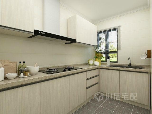 白橡實木櫥柜搭配石英石的臺面,造型簡約,功能齊全。