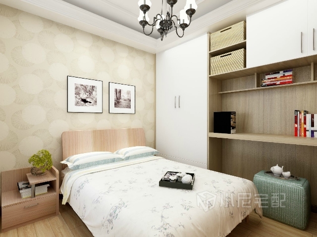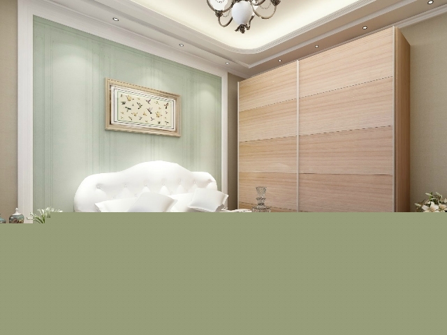 淡綠色的臥室背景墻搭配白色軟床,推拉門的衣柜,材質(zhì)多樣,溫馨舒適。