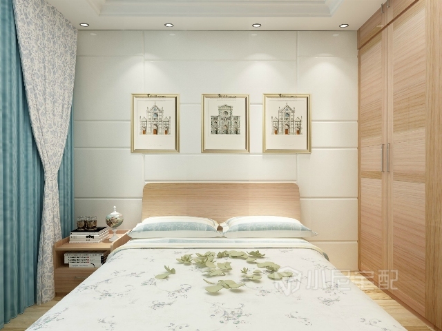色彩和客廳呼應(yīng)的淡藍色的背景墻,顯得不那么生硬,使臥室空間顯得柔軟舒適。