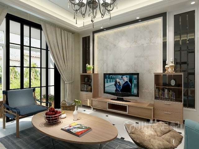 從另一個角度觀賞客廳,采光十分充足,窗簾采用了淺色調(diào)來搭配,乳白色的窗簾搭配藍色的單人沙發(fā),微風(fēng)吹過,感覺就像帶著淺淺的海洋氣息。