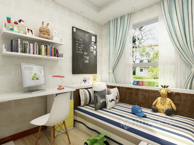 兒童房的設(shè)計一個榻榻米,節(jié)約空間,小書桌,書架,小黑板營造一個功能齊全,學(xué)習(xí)加休閑的空間,利于孩子的成長。