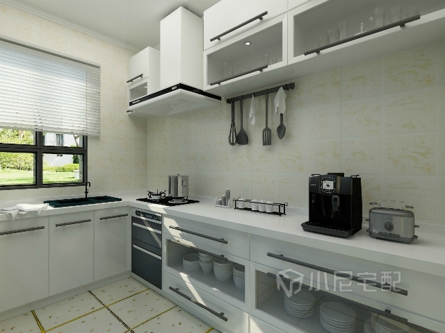 廚房全用白的櫥柜組合,視覺上顯得寬闊敞亮, 功能齊全。