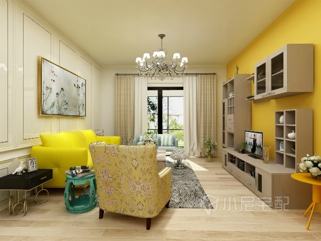 電視墻選用鮮艷的黃色,和沙發(fā)顏色相呼應(yīng),電視柜組合可以增加儲存功能,顯得空間干凈整潔。