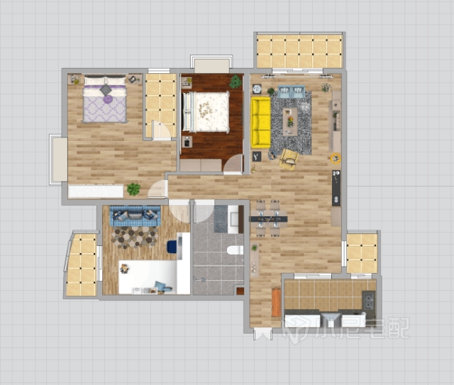 白色木飾面板,檸檬黃的布藝沙發(fā),灰色的地毯,開闊明亮的客廳,簡潔又舒適。
