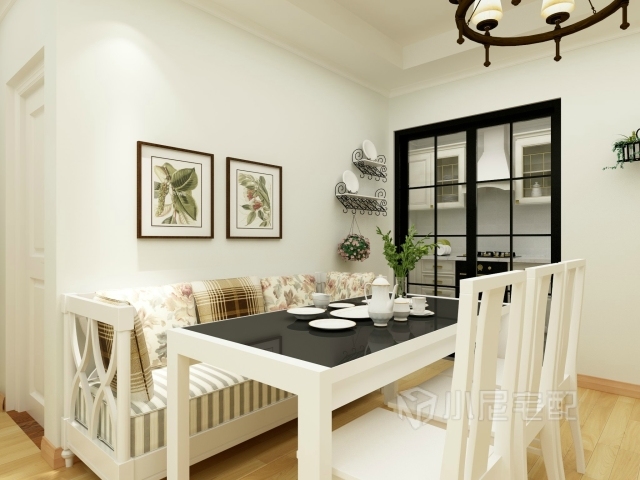 餐廳部分使用卡座增加舒適感,綠植裝飾畫和壁架上的小盆栽打造濃濃田園風(fēng)。