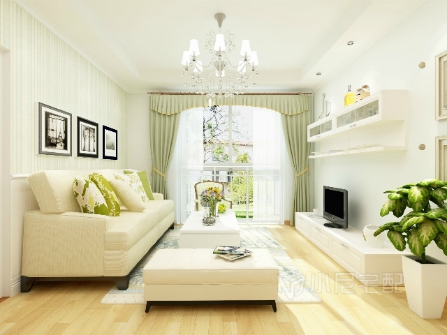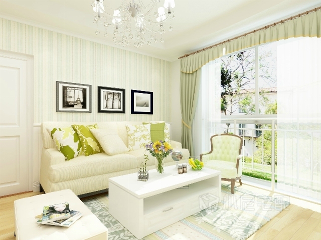 白色的護墻板,白色的布藝沙發(fā),綠色條紋壁紙,綠色花紋的抱枕與窗簾,做到色彩上的呼應(yīng)。