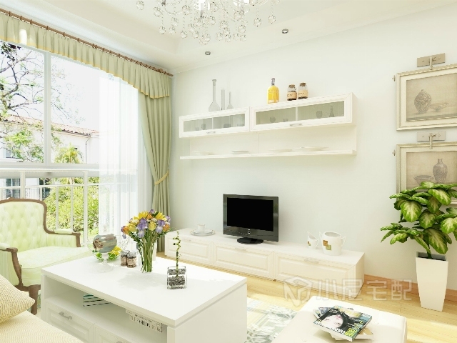 電視墻比較簡單,使用造型簡潔的電視柜組合,裝飾畫和綠植。