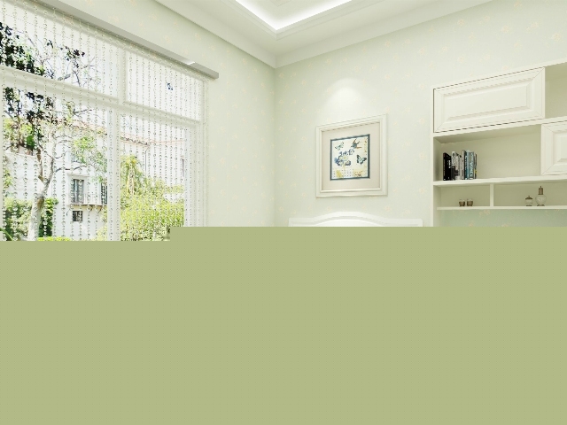 次臥選用淡綠色壁紙,顯得空間開闊,晶瑩的珠簾使房間更加通透。
