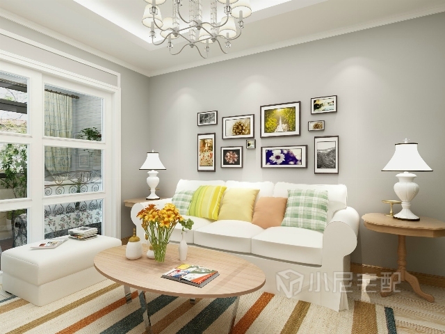 客廳裝修簡單大方,簡單的吊頂,彩色的抱枕,個性的照片墻,在清新之中又多了些大方與時尚。