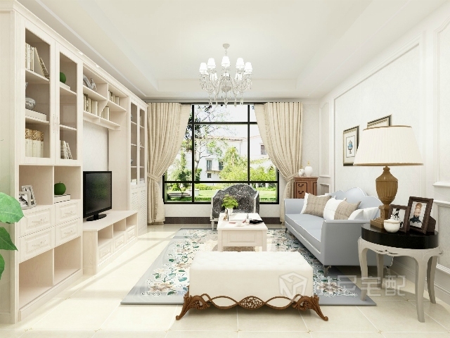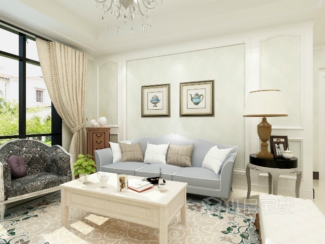 淡藍(lán)色的皮質(zhì)沙發(fā),優(yōu)雅的背景墻,帶有圖案的壁紙,地毯,窗簾,古典裝飾畫,體現(xiàn)簡(jiǎn)歐的風(fēng)格。