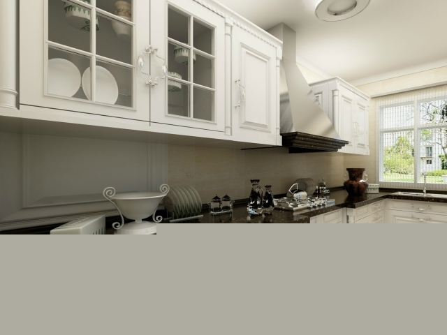 白色歐式櫥柜,黑色的石英石臺(tái)面耐臟耐磨。