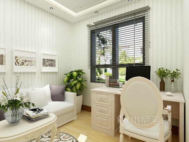 書房空間利用緊湊,書桌椅,沙發(fā),書柜,學(xué)習(xí)工作休閑融入一個(gè)空間。