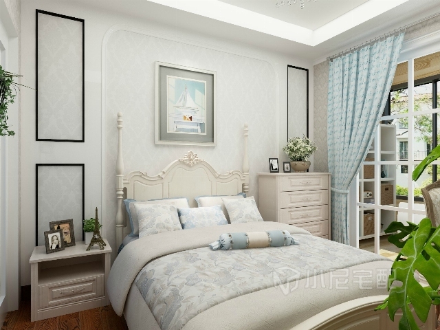 淡藍(lán)色的窗簾和背景墻相呼應(yīng),簡(jiǎn)單的歐式線條穿插在簡(jiǎn)約的空間設(shè)計(jì)之中,與配飾和諧相襯