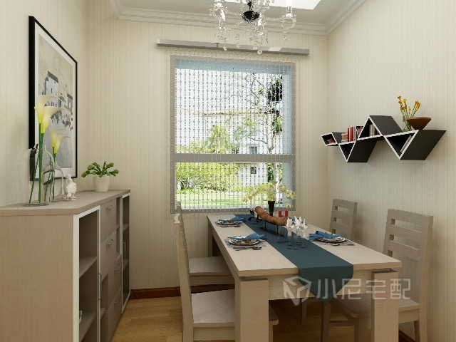 餐廳空間較小,利用餐邊柜進(jìn)行收納和裝飾,解決空間不足的收納問題。