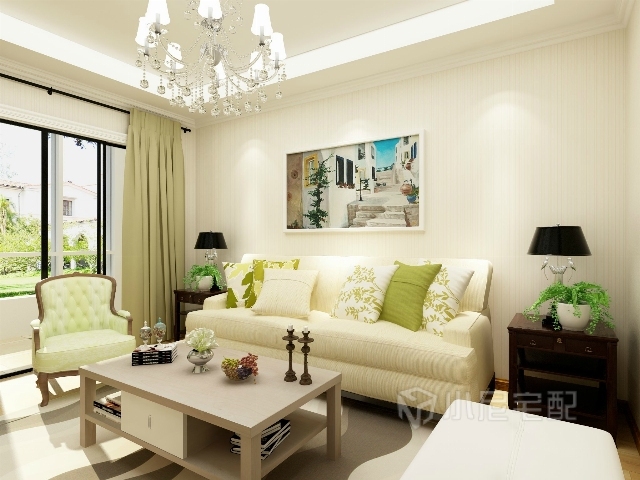綠色的沙發(fā)抱枕和窗簾相呼應(yīng),白色的布藝沙發(fā)黑色的邊幾,舒適又時(shí)尚。