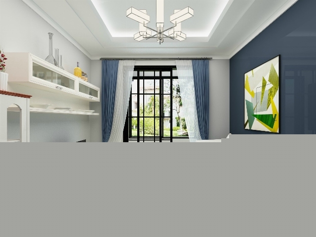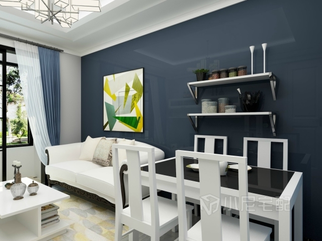 寶藍(lán)色的墻面,現(xiàn)代感十足??蛷d餐廳融為一體,節(jié)約小戶型空間。