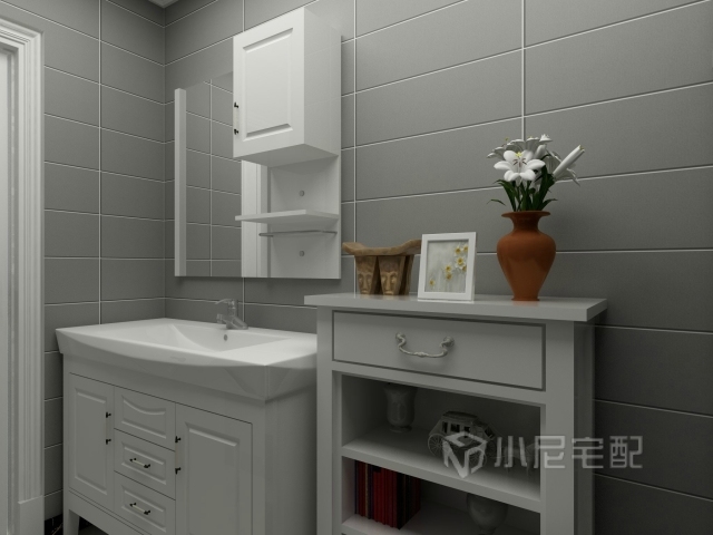 灰色的墻磚,白色的浴室柜與邊柜,美觀又實用