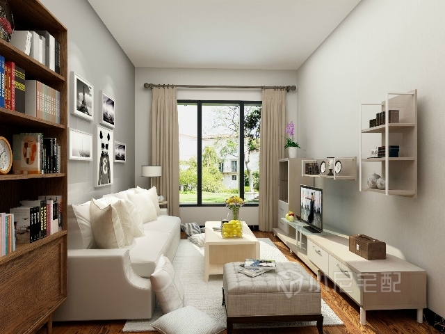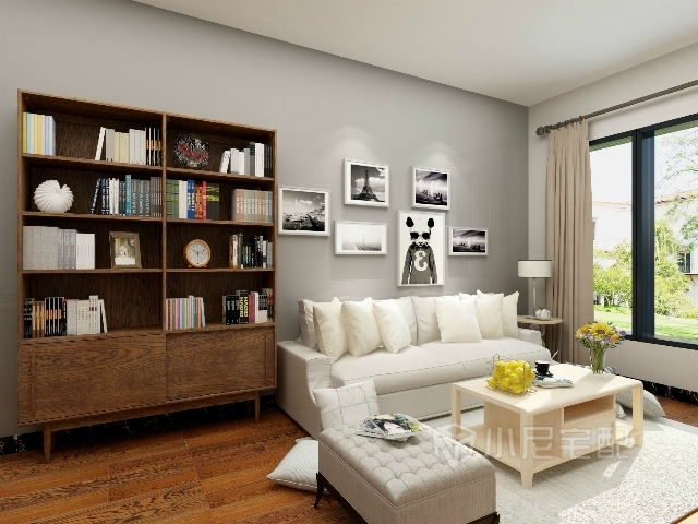 深色實(shí)木大書架,白色簡(jiǎn)約沙發(fā),個(gè)性的照片墻,體現(xiàn)知性的文藝氣息。