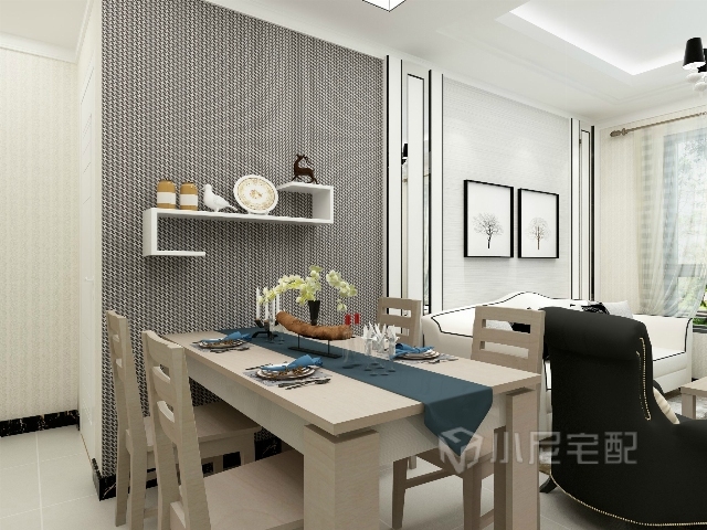 餐廳的布置十分簡(jiǎn)潔,個(gè)性的壁紙?jiān)黾訒r(shí)尚感。