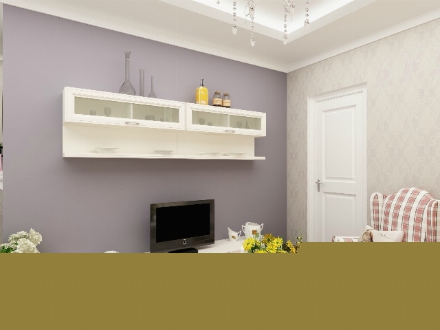 電視背景墻用顏色深一點(diǎn)的紫色涂料,襯托著白色的家具,簡(jiǎn)潔大方。