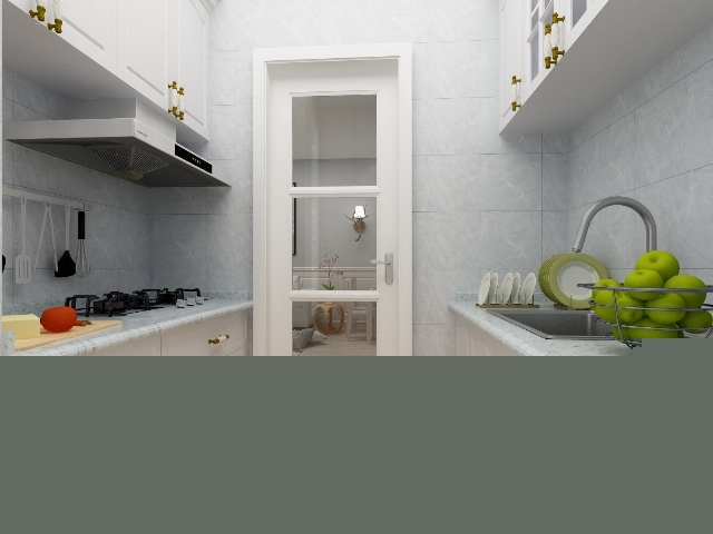 廚房的墻磚和臺(tái)面都采用了淡藍(lán)色的設(shè)計(jì),清新自然