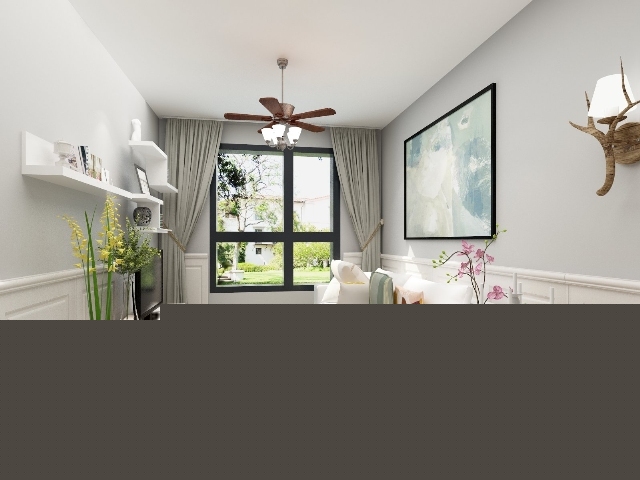 從窗戶看進(jìn)來(lái),湖藍(lán)色的墻面背景很有美式的特色