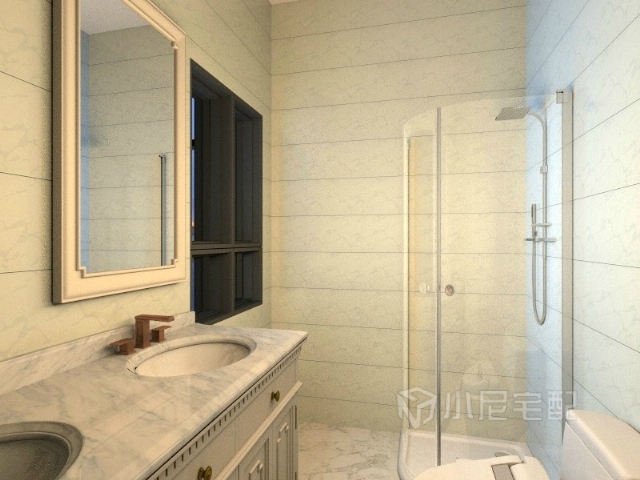 透明玻璃洗浴間,淺色洗手池,大方簡單的感覺。
