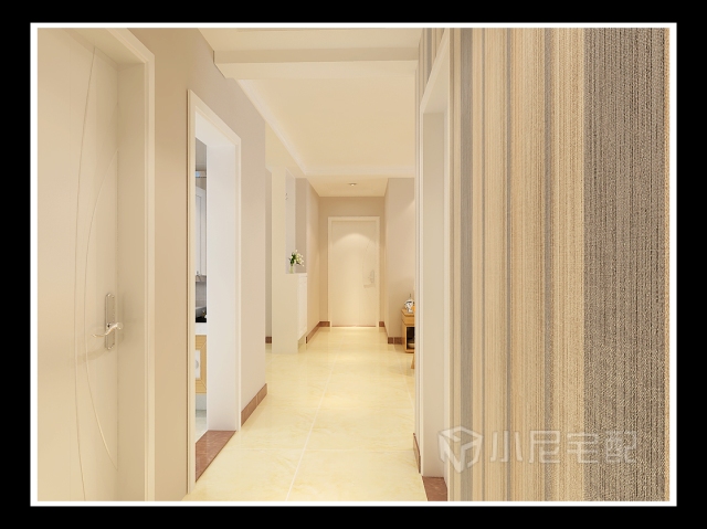 回字形吊頂,鵝黃色地磚,加上樹(shù)直紋的壁紙,使得原本直長(zhǎng)的玄關(guān),表現(xiàn)的柔情似水
