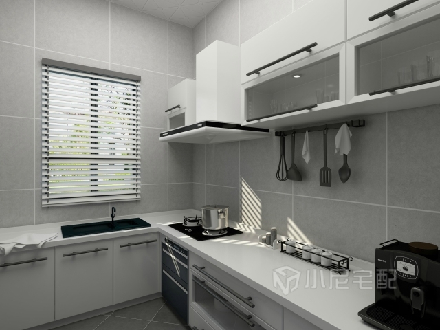 廚房白色柜體搭配淺灰色墻面,干凈整潔,功能設施齊全。