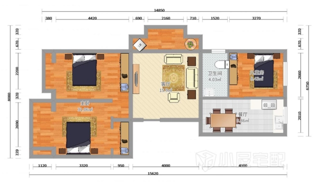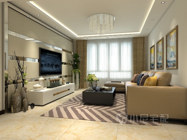 現(xiàn)代簡約風(fēng)格,電視墻利用硬包,加深線條性. 秋雨古銅的全套家具是整個屋子青春有活力的氣息。
