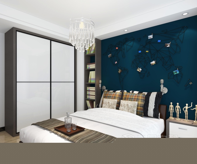 進(jìn)入臥室,背景墻采用深色壁紙,搭配淺色吊頂,亮光烤漆白衣柜,運(yùn)用顏色的對比,使空間更加清爽