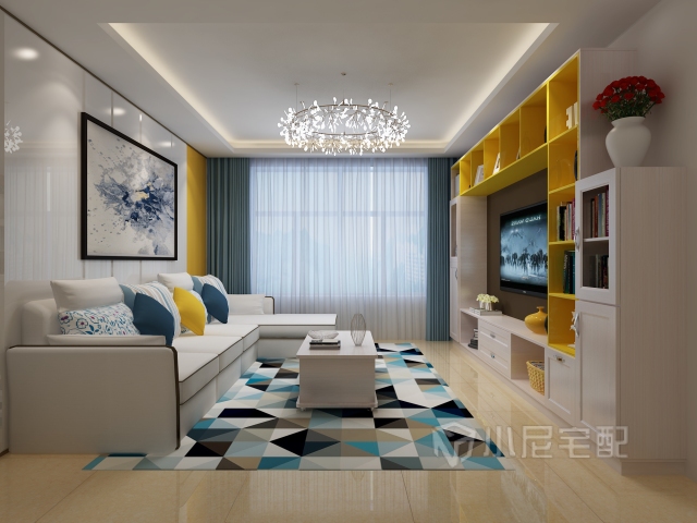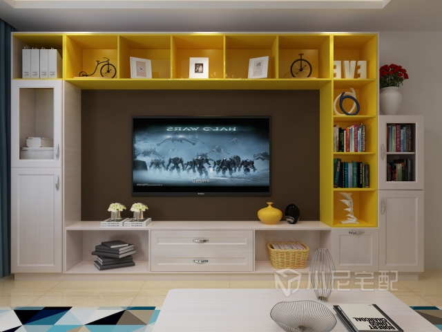 整面墻定制柜體,明黃色點綴著客廳空間,活力十足。